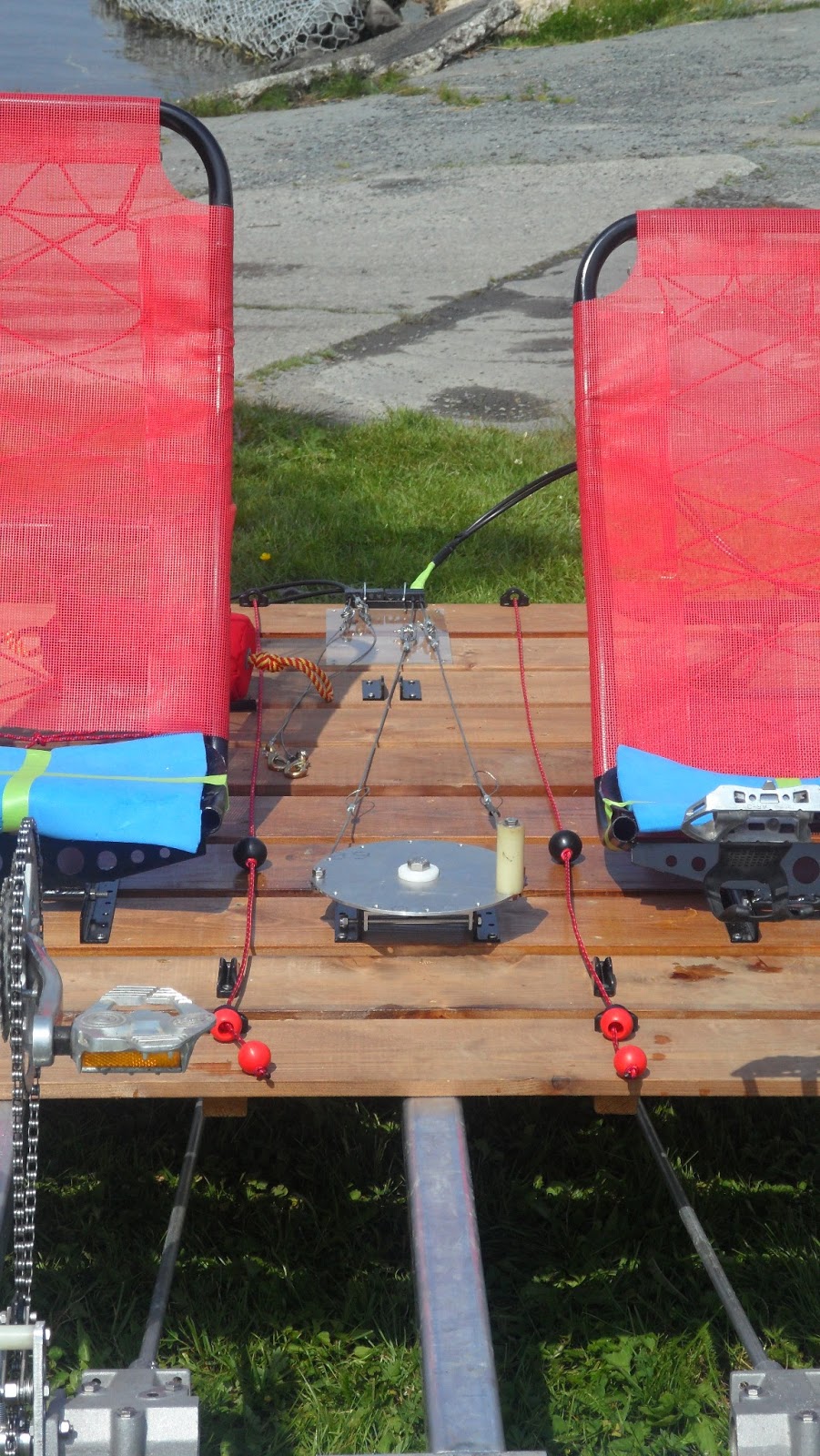 So on Sunday morning the boat was fully assembled on the shore and carried to the water, clearly this thing has been eating well over the winter because it is a LOT heavier than the ideal...........Anyway, we paddled away from shore and dropped the props in while the boat was drifting, I started to pedal and it felt like the boat felt like something was dragging on the bottom......I looked back and realized the prop was turning the wrong way and we were in reverse!!! At some point I got the gearboxes on the wrong side doh!! An easy switch and off we went again, this time it worked well. It was quickly evident that we were going to have to come up with a way to increase the rpm of the prop because the boat was certainly not at full speed when we were pedaling as fast as possible. But everything worked okay and the props did not hit even during hard turns.